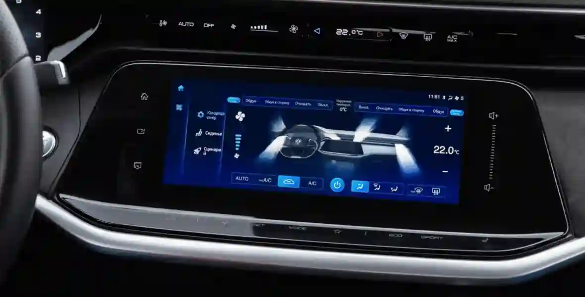Двухспицевый руль — без сенсоров, вместо них — привычные блоки кнопок. Несколько старомодные внешне, но от этого не менее удобные. Совсем без тач-панелей Shine Max не оставили: сенсоры собраны под центральным дисплеем и над ним, где располагается блок, отвечающий за основные настройки климат-контроля. Причём они слушаются даже пальцев в тонких перчатках! Жаль только, что среди них нет управления подогревами сидений: за этим приходится «проваливаться» в меню мультимедийки.
