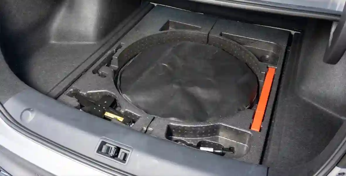 Примерно та же картина в багажнике номинальным объёмом 428 литров. Пара больших чемоданов помещается без проблем, вокруг и сверху можно положить ещё что-то некрупное — но на этом всё. Ниш для мелочёвки, крючков или петель на полу не предусмотрено, нет даже внутренней ручки на крышке багажника. Её петли норовят спрессовать груз, под полкой торчат провода и катушки динамиков. А спинка дивана складывается только целиком. В общем, полное ощущение, что грузовой отсек проектировали по принципу «чтобы был». И вдруг приятный сюрприз: под полом обнаруживается запаска, аккуратно упакованная в специальный чехол на молнии. Он сильно выручит, если придётся менять колесо где-то в весеннюю слякоть.