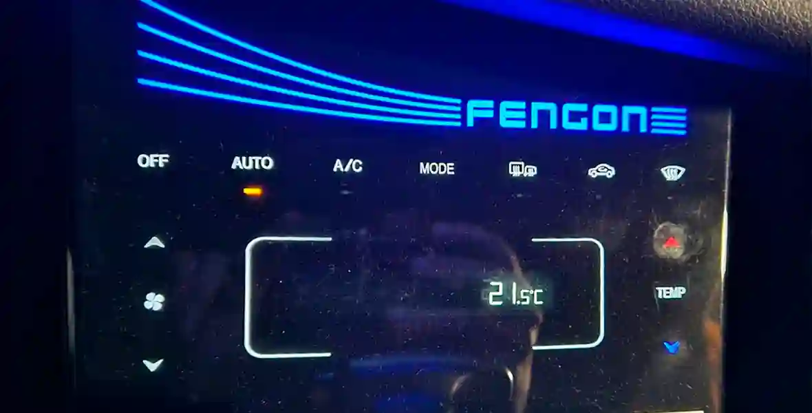 Плюс на этой панели очень выделяется синяя подсветка надписи Fengon, что особенно заметно вечером. К слову, этих самых надписей в салоне немало, например, они есть на руле и передней панели. При этом сам климат, по меркам китайских машин, работает крайне адекватно. При температуре в минус 16 на улице в салоне было стабильно тепло. Никаких запотеваний, резких перепадов температуры или неожиданных потоков холодного воздуха. Даже в морозы прогревается автомобиль быстро.